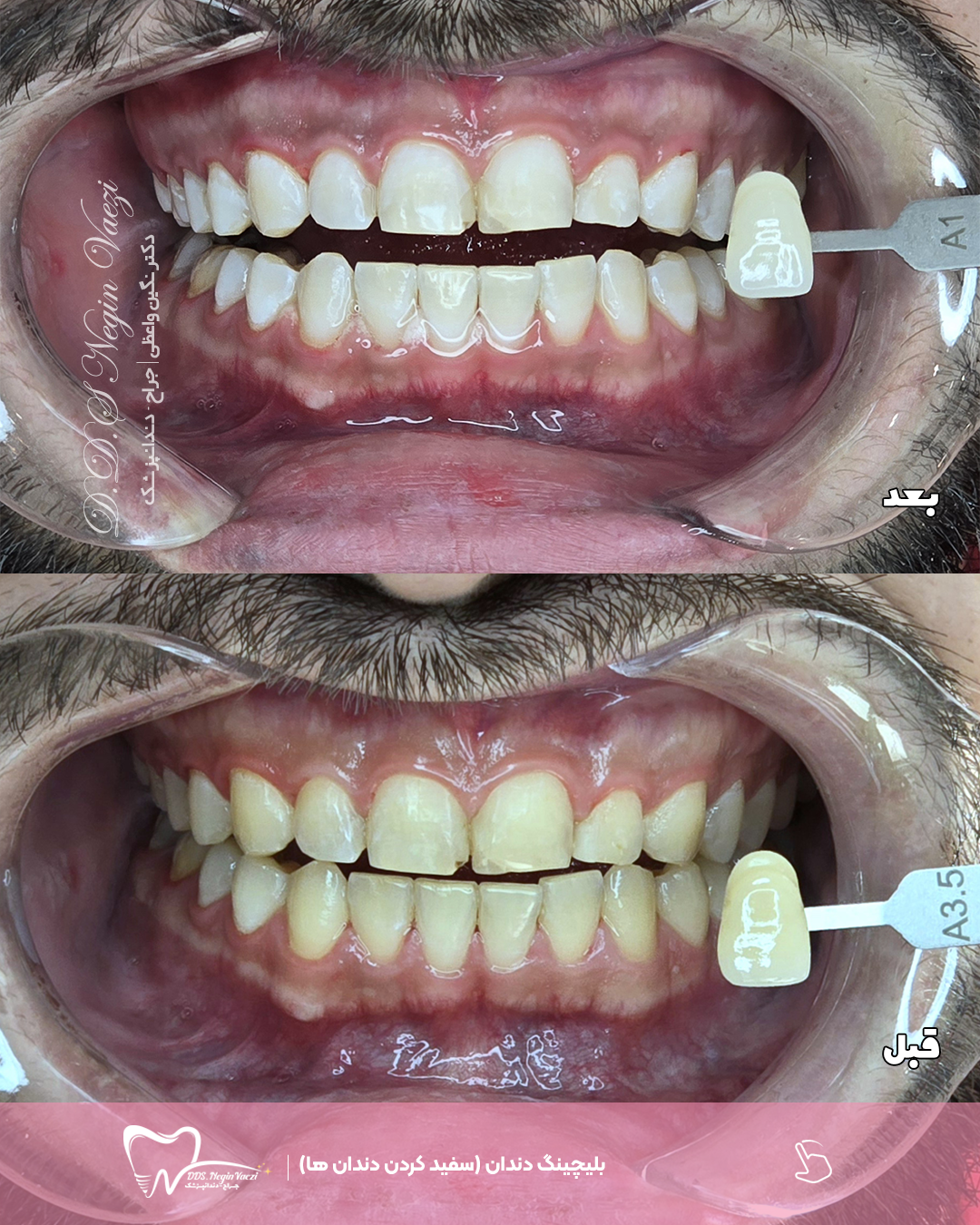 ✅ نتیجه: تنها در یک جلسه، دندان ها چند درجه روشن تر شدند و لبخند بیمار جلوه ای طبیعی و زیبا پیدا کرد.